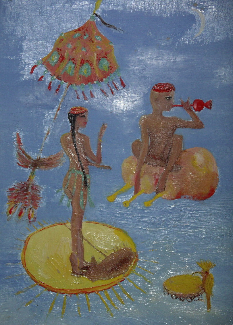 Auf einem anderen Bild "Tausendundzweite Nacht" (Ölfarben 31 x 22 cm.) stellt einen ruhigen Moment dar, wo der Junge Musik und der Märchenvogel auf dem Tamburin spielt.