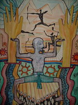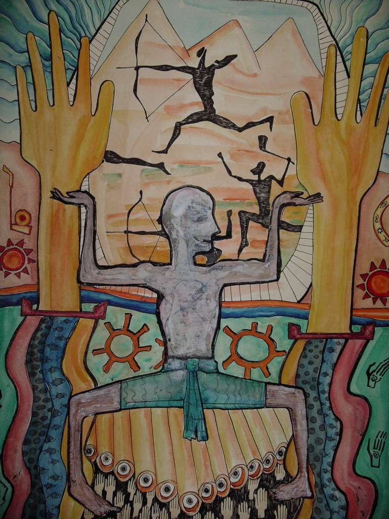 Auf dem Hintergrund sind die Berge mit Felszeichnungen, im Zentrum des Bildes tanzt ein Tänzer auf den Blasrohren. In seinem Inneren